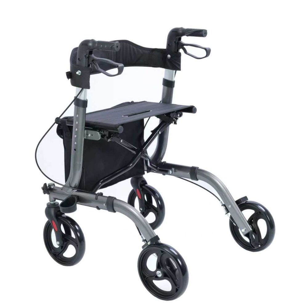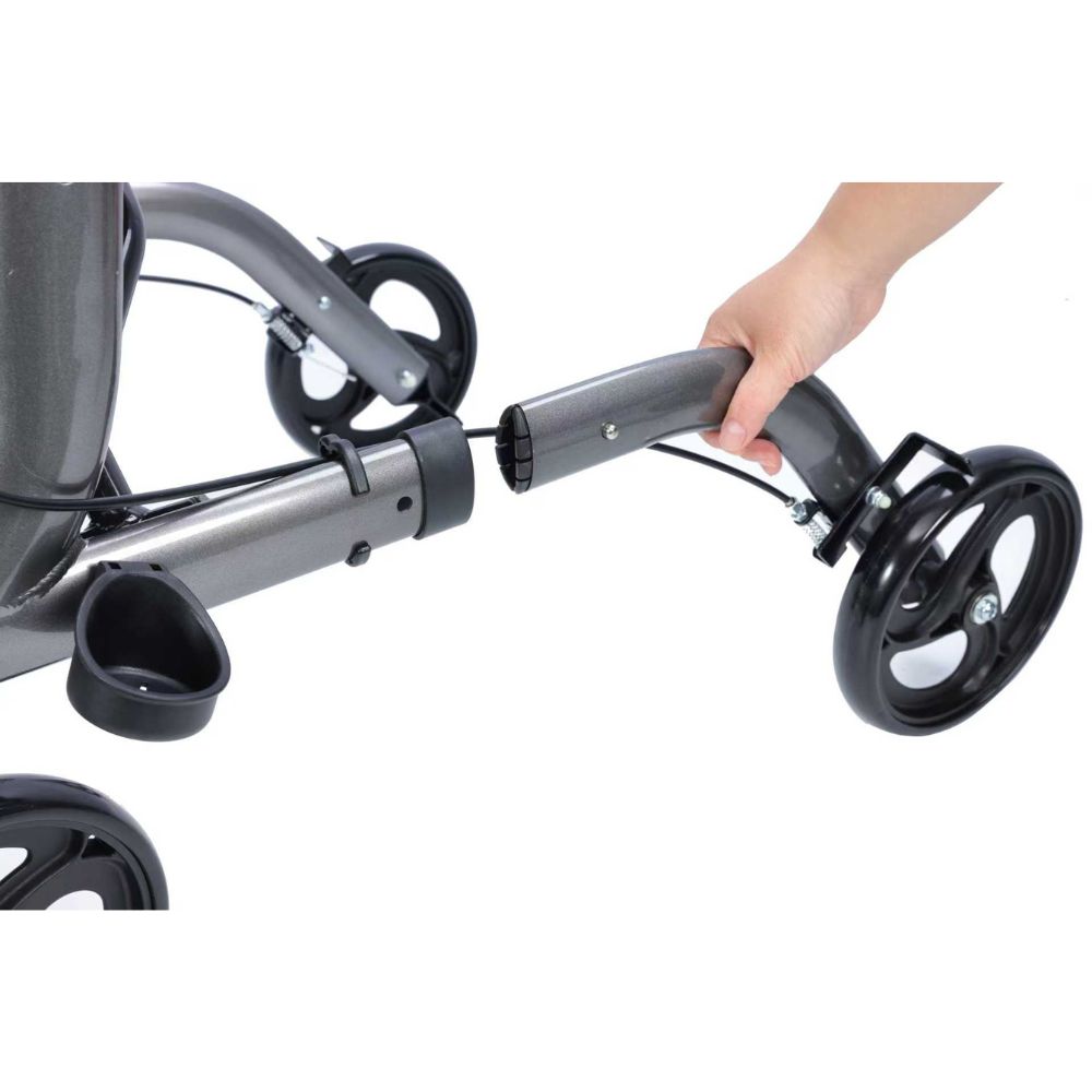 - Rollator plegable con ruedas desmontables para ahorrar espacio y facilitar su transporte