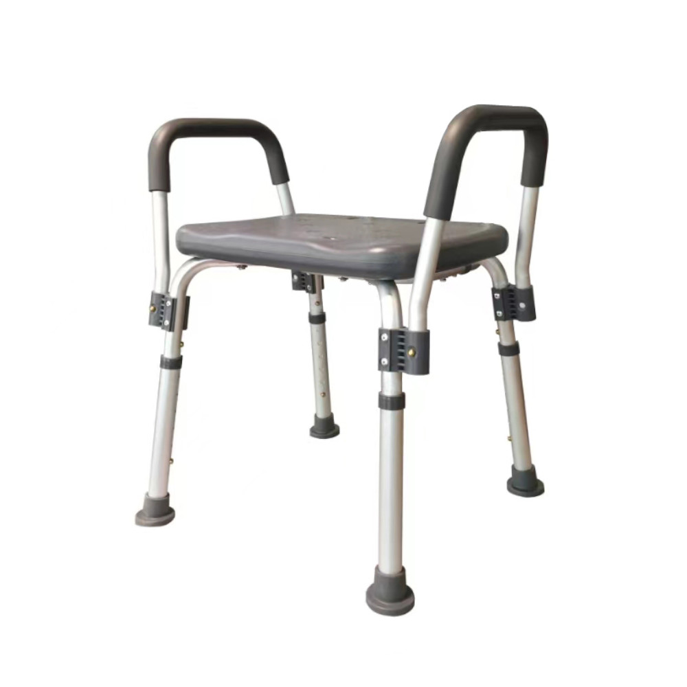 Banqueta de baño con brazos regulable en altura, sus reposabrazos acolchados ayudan al agarre e incorporación.