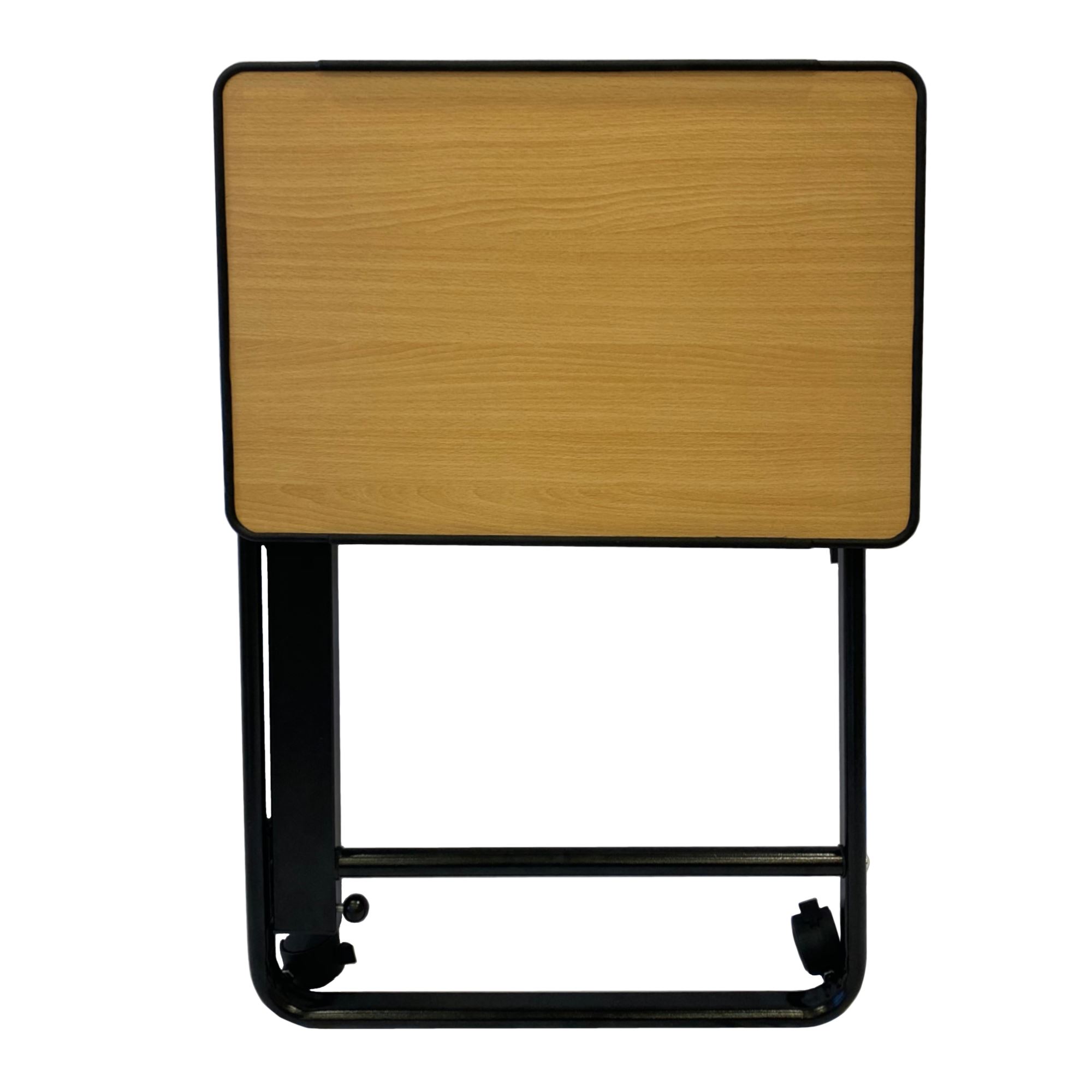 Mesa auxiliar plegable con tablero abatible, el tablero tiene un borde externo para evitar la caída de objetos.