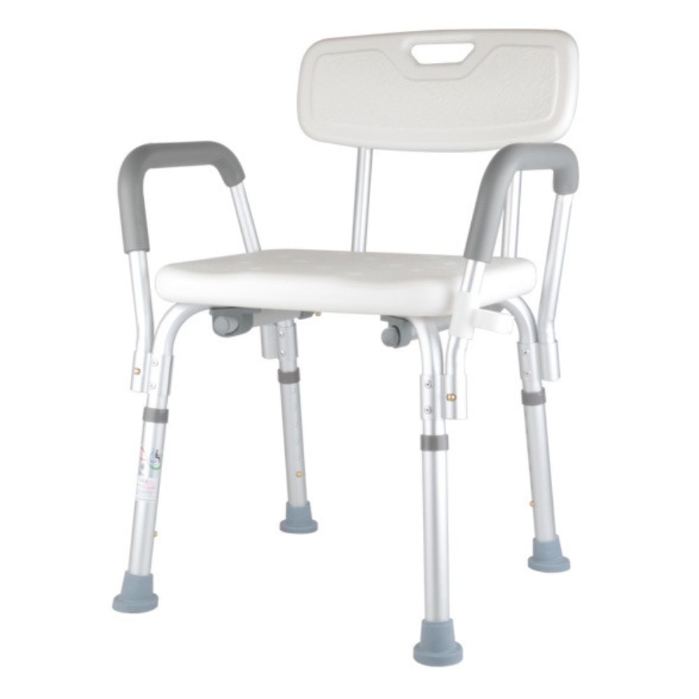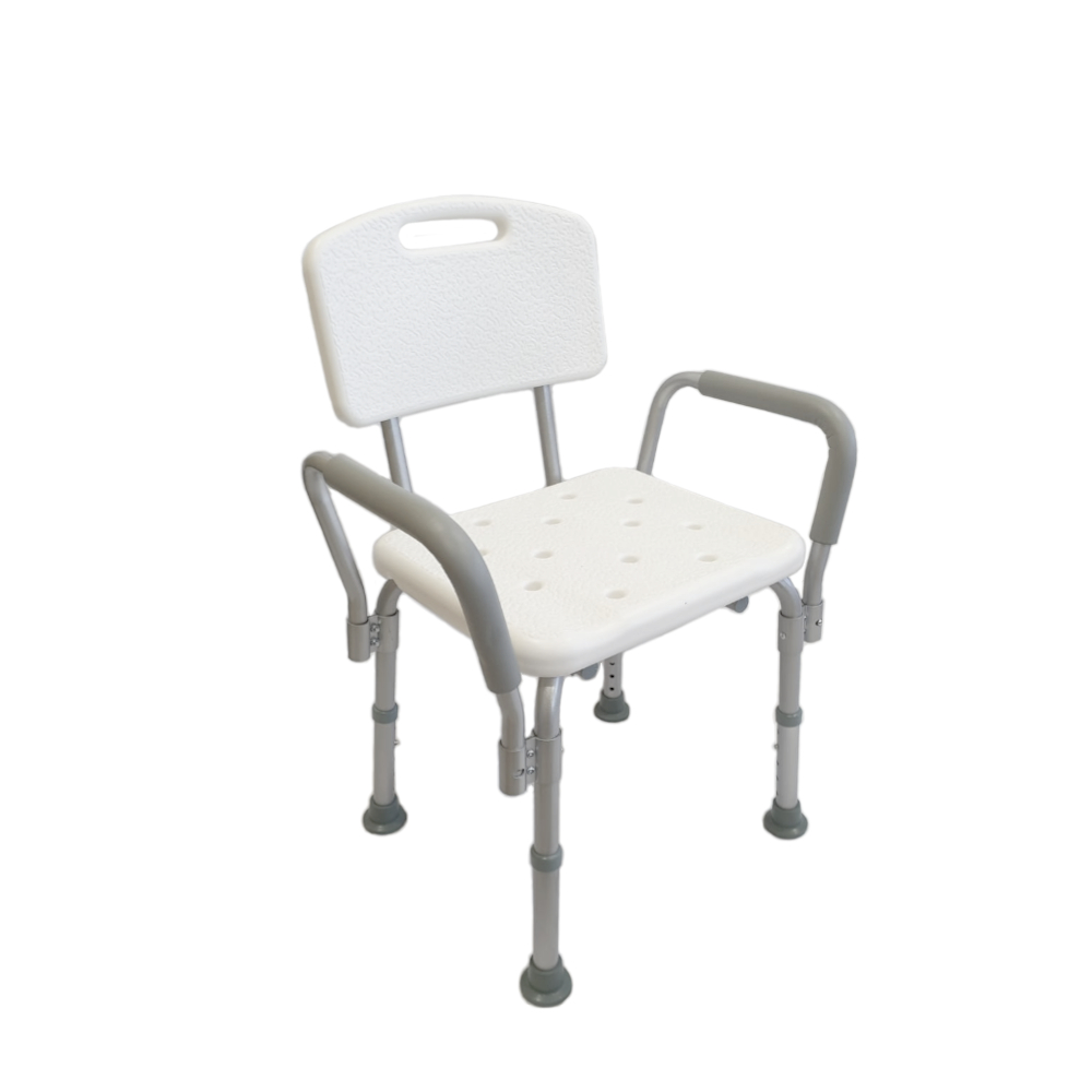 Silla de baño con reposabrazos y respaldo regulable en altura, sus reposabrazos acolchados ayudan al agarre e incorporación.
