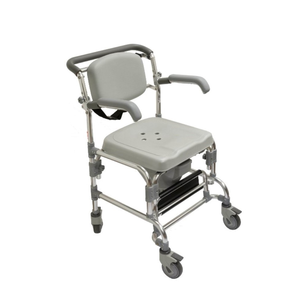 Silla 3 en 1, es silla de transporte, silla de ducha y silla con inodoro.Además se puede colocar directamente en el WC al extraer la cubeta.