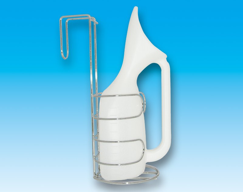 Soporte de orinal para cama. Puede colgarse gracias a sus ganchos, evitando así riesgos de caídas y derrames.