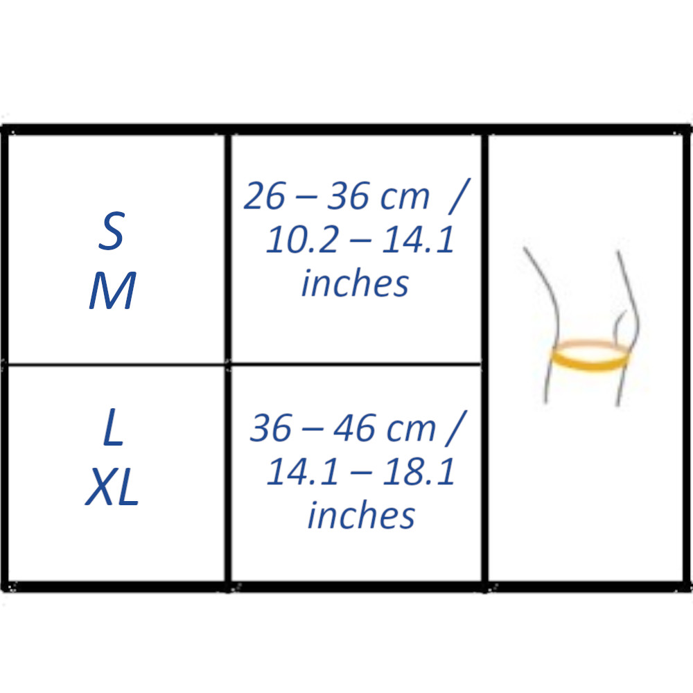 Soporte patelar, almohadilla de compresión infra patelar con cierre de velcro confeccionado en material multicapa de silicona (Silprene-F™), transpirable y elástico, que permite regular la compresión y la tracción ejercida sobre la zona afectada en función de las necesidades de cada paciente.